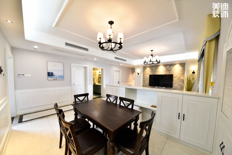 為了能和外部空間有互動,設計師高旸在餐廳窗洞的位置做了歐式風獨特造型,既保留了窗戶功能,又有著濃濃的簡歐風情。