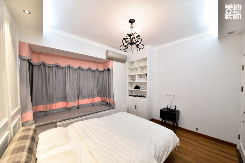 采用大面積的白色,加上粉灰色的窗簾點綴,臥室的整體設計是比較通透和明亮。小巧的床頭椅功能性很強,不管是擺放裝飾還是放置小物品都綽綽有余。
