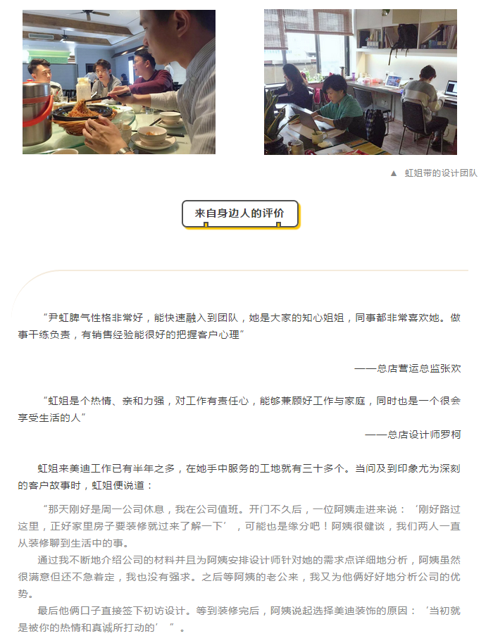 虹姐剛來美迪裝飾的時候,她確實不是很適應,因為之前從未接觸過這一行業,對很多裝修的東西都不懂。但好在之前也是做銷售的,能夠很好的與客戶溝通,同時能夠把握客戶的需求心理,再加上有總店的營運總監張歡手把手的教,所以虹姐也相信自己能夠勝任這一職位。