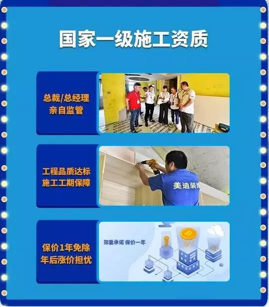 還在猶豫年前還是年后定裝修嗎?美迪裝飾鄭重承諾保價(jià)1年,用今年的價(jià)格裝明年的新家!更享總裁/總經(jīng)理親自監(jiān)管,確保工程品質(zhì)達(dá)標(biāo)、施工工期保障。