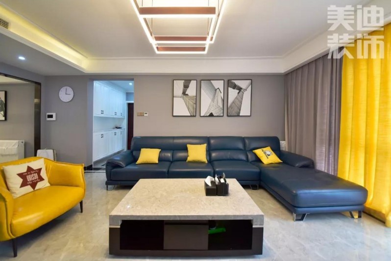 整個(gè)空間調(diào)性以灰色為主,凸顯空間質(zhì)感,沉靜的深藍(lán)色皮質(zhì)沙發(fā)與活潑黃色調(diào)的枕頭點(diǎn)綴使空間亮了起來(lái)。