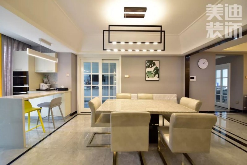房主楊姐特別喜歡研究菜品,經(jīng)常在家做西點(diǎn),追求精致的生活。設(shè)計(jì)師在設(shè)計(jì)中盡可能減少隔墻,弱化視覺(jué)阻礙的同時(shí)放大空間的通透性,從而使整體空間氛圍更加簡(jiǎn)潔典雅。在色彩方面,采用對(duì)比色相搭配法,體現(xiàn)出空間的視覺(jué)焦點(diǎn),彰顯活力。
