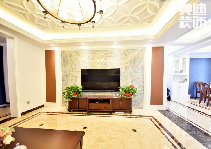 2、起居室一般較客廳空間低矮平和,選材上也多取舒適、柔性、溫馨的材質組合,可以有效地建立起一種溫情暖意的家庭氛圍,電視等娛樂用品也放在這一空間中,可以想象在電視廣告的聲色、鍋碗瓢盆的和樂、孩子嬉戲的雜音下,這“三區一體”的其樂融融。
