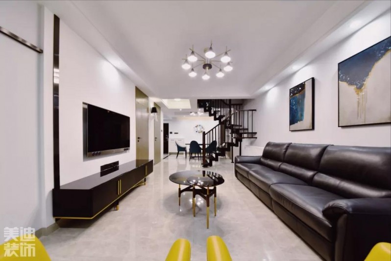 整個空間樓梯起到點睛之筆的作用,樓梯不僅起到了藝術的效果,同時將客廳和餐廳隔斷。沙發墻的現代裝飾畫以及黃色單人椅給客廳帶來俏皮和活力。