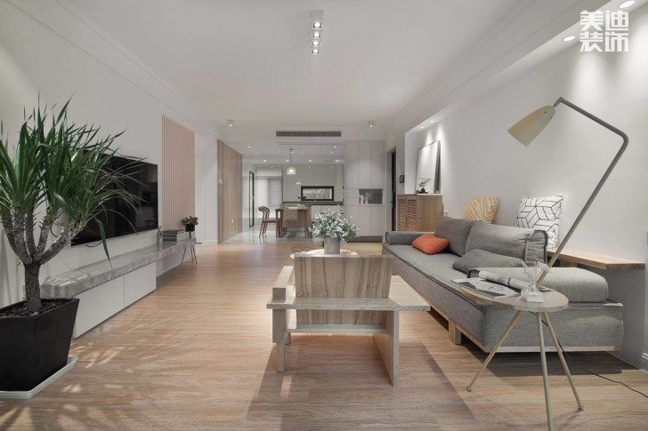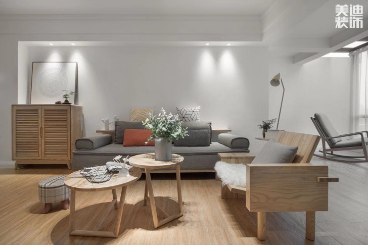 設計周軍華這組設計怎么看都是滿屏的春天感。原木色系的木具家裝,遇上淺灰色系,在加上一點點色和綠色的點綴,像是初春萌芽的松動~