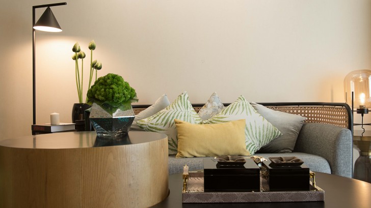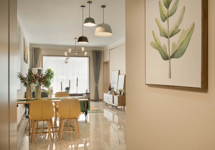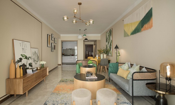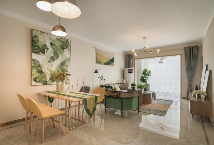 客廳利用淺色地磚和白色天花板作為背景色,而墻面、電視墻和沙發家具則利用各種綠色和嫩黃色作為主色調,渲染一副清新的美好畫面。