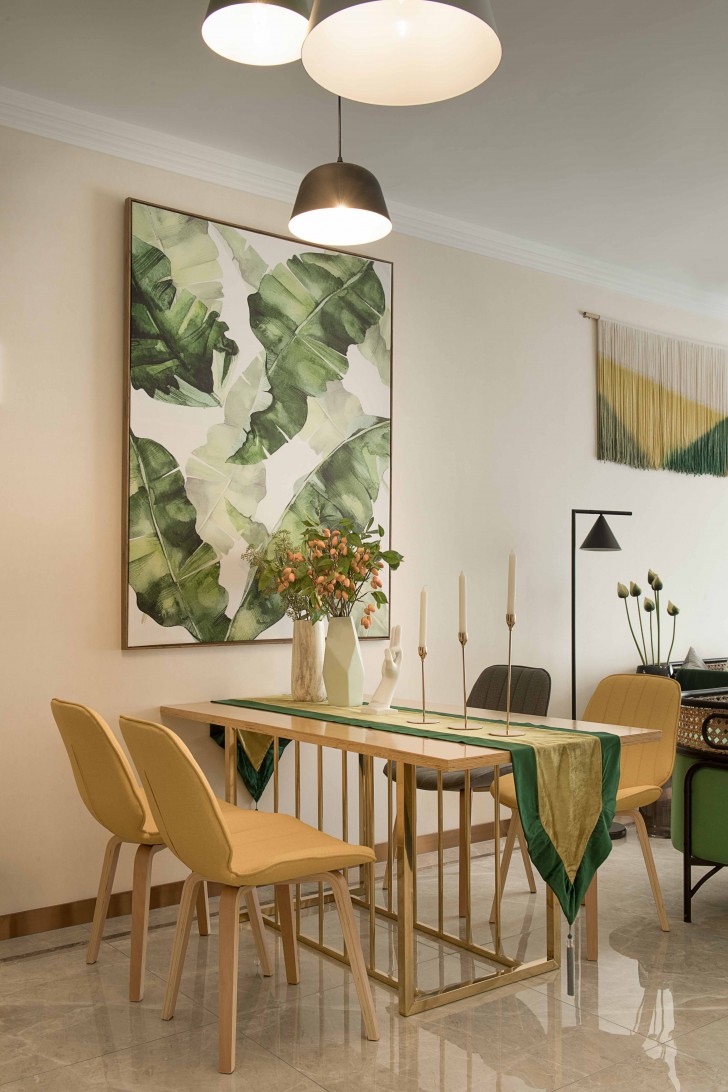 餐廳餐桌椅以深木色木質餐桌和淺綠色皮質餐椅組成,餐廳背景墻作淺綠色硬包設計,掛和那個一組美式風情裝飾畫,加上桌面和地面的花朵綠植,格外讓人陶醉。