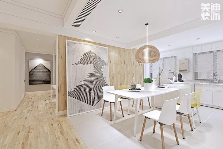 在公共區域的地面,玄關和廚房均使用瓷磚,而客廳、餐廳、臥室則使用原木地板,這樣的過渡方式,讓各個空間之間的區隔顯得更加自如。