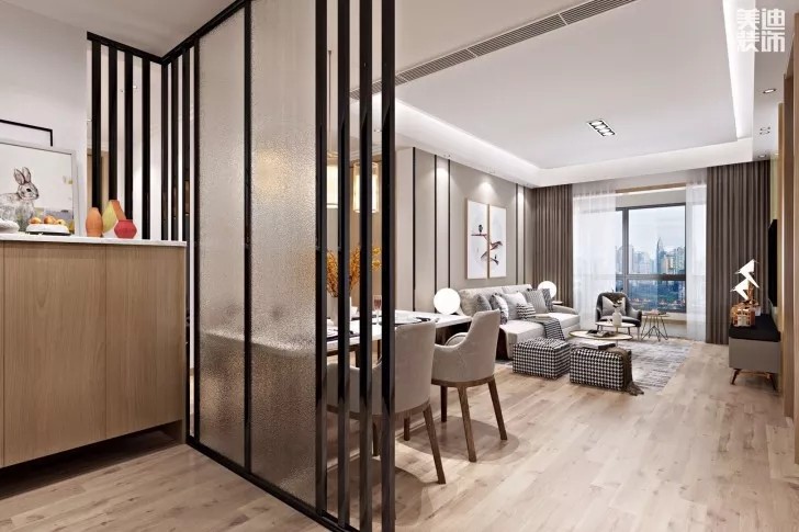 客廳靠墻擺放沙發,靠著沙發做了一個簡單的隔板隔斷,可以擺放一些裝飾品,后面就是一個比較有情調的餐廳了。