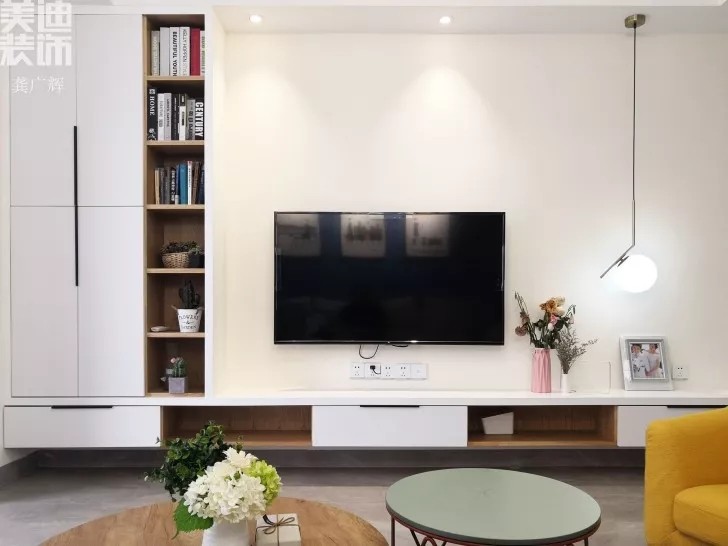 其實很簡單,將空蕩蕩的電視背景墻充分利用起來,定制成一個集電視、書架和物品展示于一體的多功能柜體,就能讓家里憑空多出一間“書房”,同時又增加了不少收納空間。