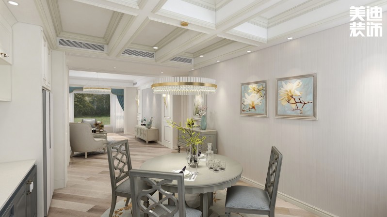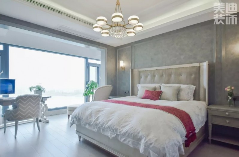 白色、灰藍(lán)色背景墻的簡(jiǎn)約柔和與淺灰色家具相得益彰,產(chǎn)生恰到好處的舒適度,龍思洛設(shè)計(jì)師在色彩搭配上極其巧妙,灰藍(lán)系適中的色彩調(diào)性散發(fā)優(yōu)雅酷感的空間氣質(zhì),再加水晶吊燈渲染,盡顯奢華。