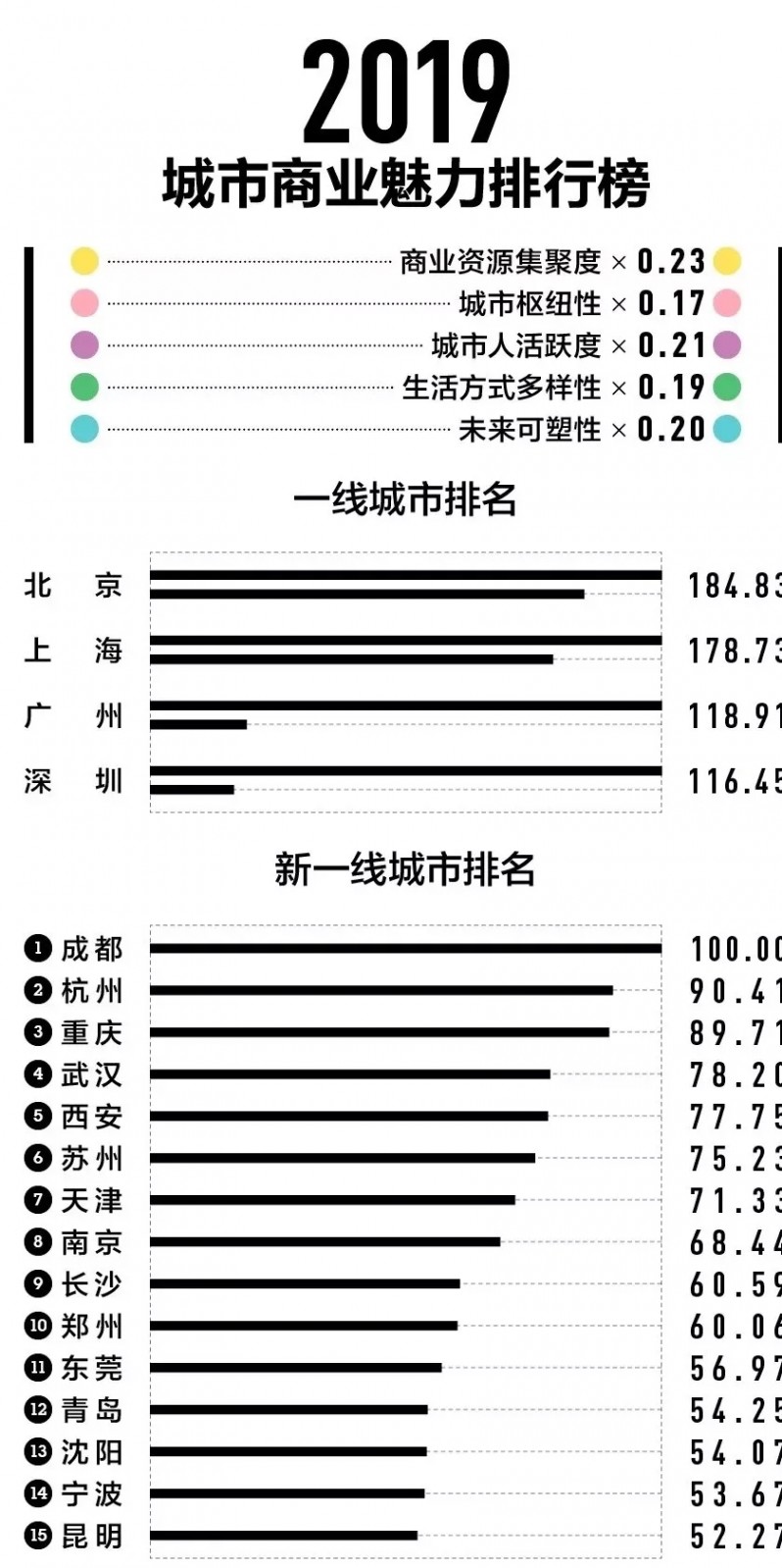 根據榜單,一線城市的座次從去年的“上北深廣”重歸“北上廣深”。2019年,15座新一線城市依次為成都、杭州、重慶、武漢、西安、蘇州、天津、南京、長沙、鄭州、東莞、青島、沈陽、寧波、昆明。前四名城市排名相對穩定,長沙排名較去年上升一位。