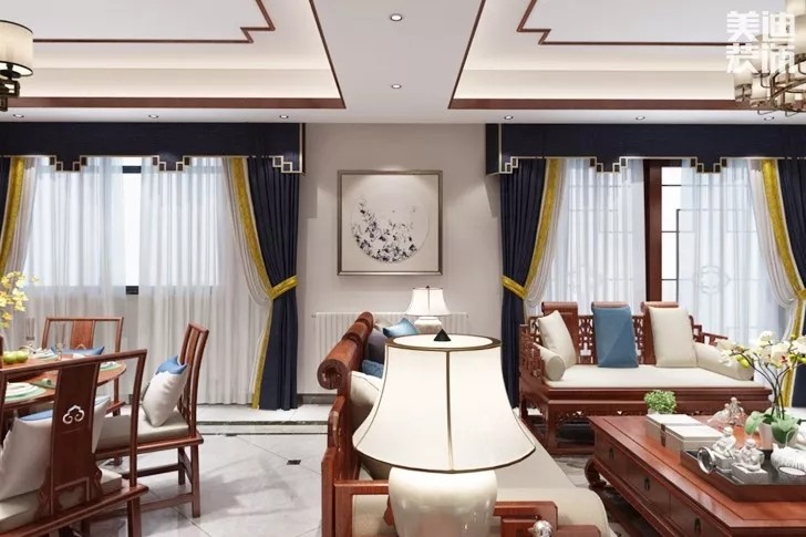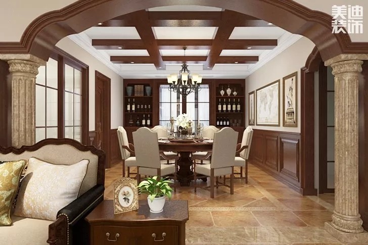 倘若空間比較大,可以把這堵墻延伸至天花板,在客廳與餐廳之間形成一個“回字形”動線。
