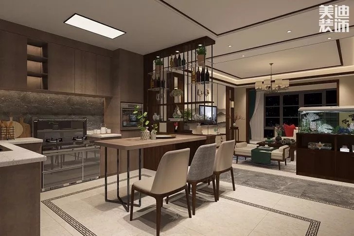 這里的「半墻」概念比較寬泛,不一定是磚砌的墻,吧臺、半人高的餐邊柜都可以歸為此類,特別適用于長窄型的客餐廳區域。