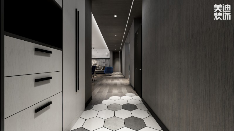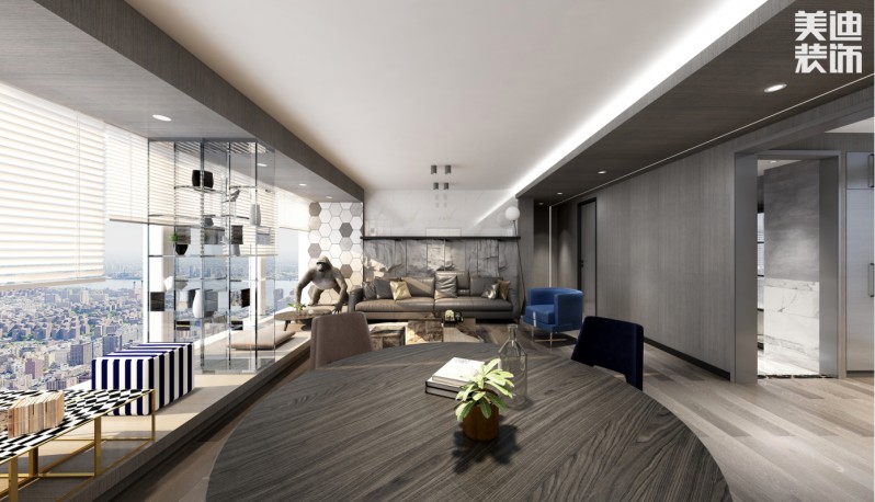 材質的碰撞造型的不均,也讓整個空間更加的有棱有闊,更加干練。另外,材質的統一,決定了色彩的統一,黑白灰的配色凸顯出空間的調性。