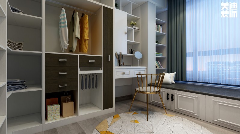 將金屬、玻璃的元素作為輔材裝飾,是現(xiàn)代風格的常見裝飾手法,能給人帶來前衛(wèi)、不受拘束的感覺。而香檳色的金屬更具高級感,完美契合輕奢調性。李曌曦設計師的這套作品打破了整體空間的線條感,以動制靜充滿朝氣,而且時尚靈動。