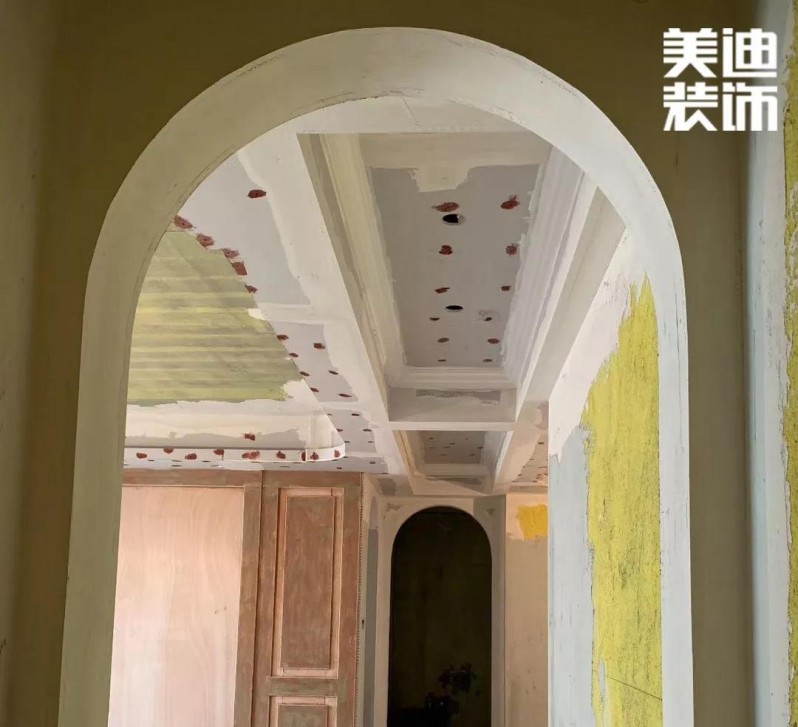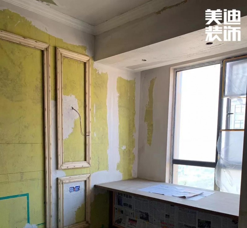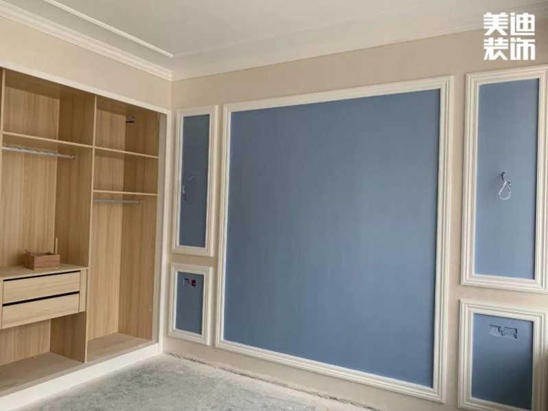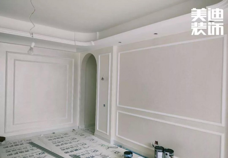 由于是歐式風(fēng)格,石膏線是必不可少的,之前看了很多的案例圖和實景圖做了大量的功課,發(fā)現(xiàn)平平的墻面只要加了石膏線就立馬不一樣了。油漆是六月份開始,先是做了石膏線,線條安裝完畢后,油漆工繼續(xù)進(jìn)來,先把有釘子的地方都填填補(bǔ)補(bǔ),弄好了就好噴漆啦!