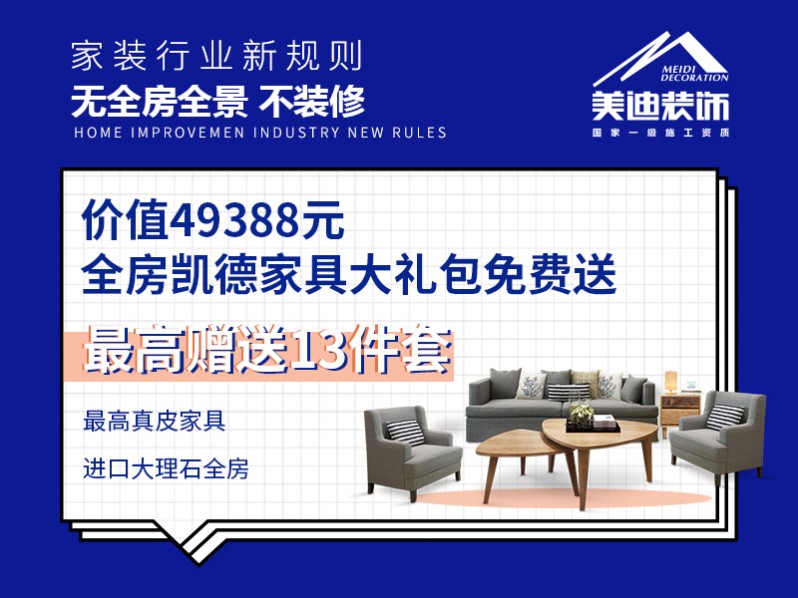 家裝行業新規則,無全房全景不裝修。價值49388元,全房凱德家具大禮包免費送,最高贈送13件套。