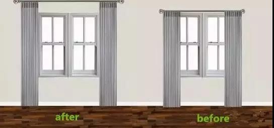 拔高窗簾桿的高度:上至天花板、下至地板的窗簾自帶延伸效果,視覺上制造了一種更大的空間感。不信看下圖是不是感覺左邊的窗戶更大?
