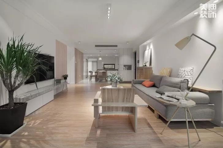 純粹的白調,溫暖的木調,以一種平靜的方式,傳達空間色彩美學,清新透亮的色彩,弱化了周遭的一切,達到客廳空間“寬敞明亮”的效果。