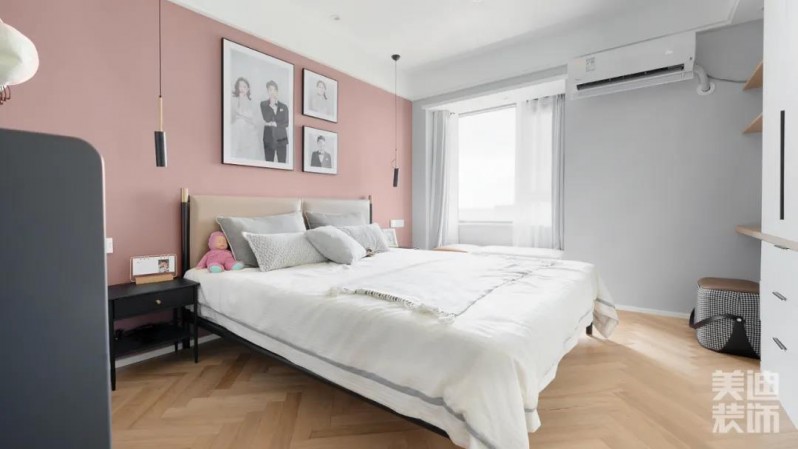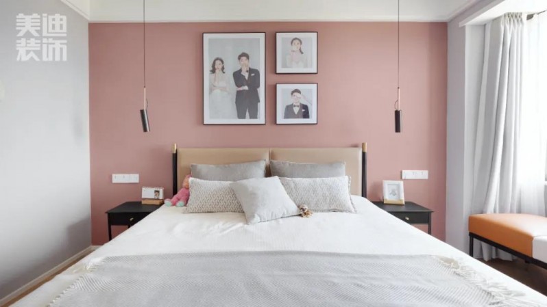 臥室粉白搭配的顏色,現代設計感的吊燈垂于床頭兩側,細小精致,增加了空間的時尚感。粉色背景裝飾上婚紗照片,整個空間充盈著新婚的甜蜜與浪漫。