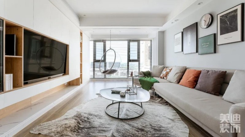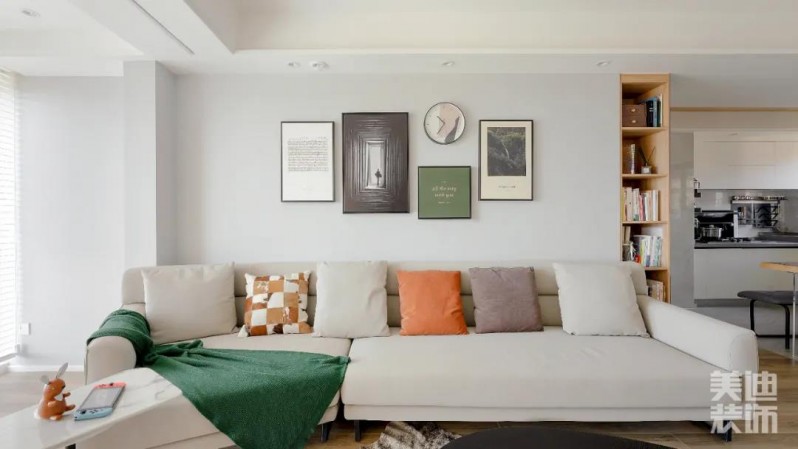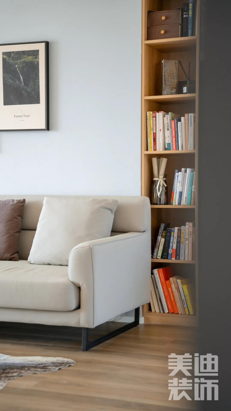 采用最簡單的白色作為背景色,以簡約的掛畫作為裝飾,右側嵌入式的原木色豎向開放格設計,可以將生活物品輕松儲藏,客廳空間感很是干凈清爽。
