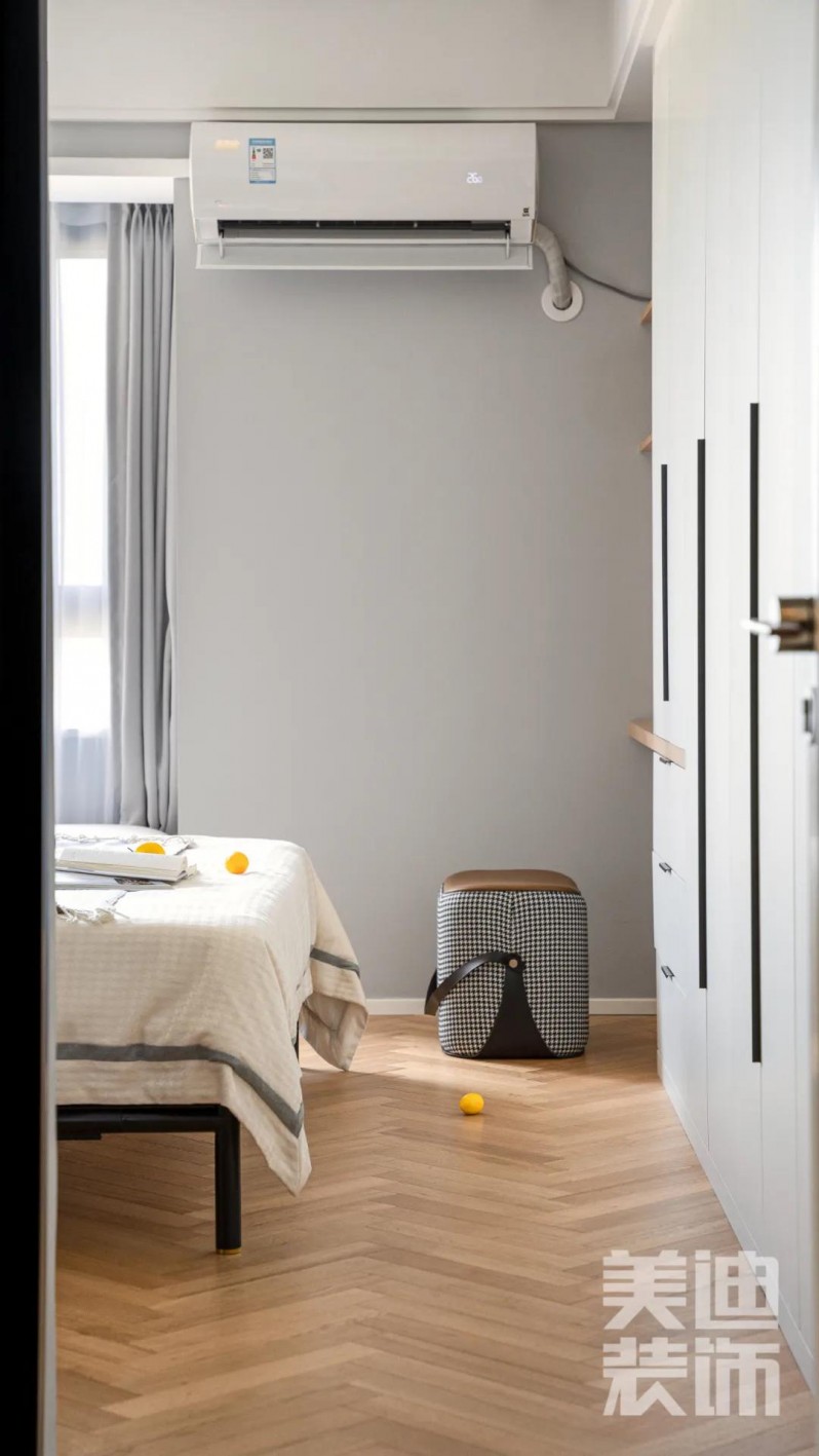 通過墻體改造,做出了一個滿墻的衣柜,滿足業主的多種收納,柜門采用整塊門板到頂加黑色長拉條拉手設計,排列組合出成比例的豎向線條,視覺向上延伸,拔高層高,到頂的門板設計,還可以替代投影幕布,非常實用又非常的美觀大氣。