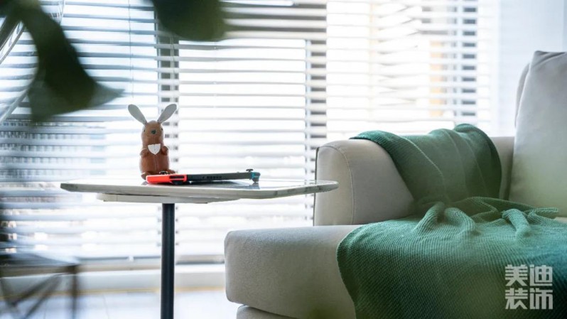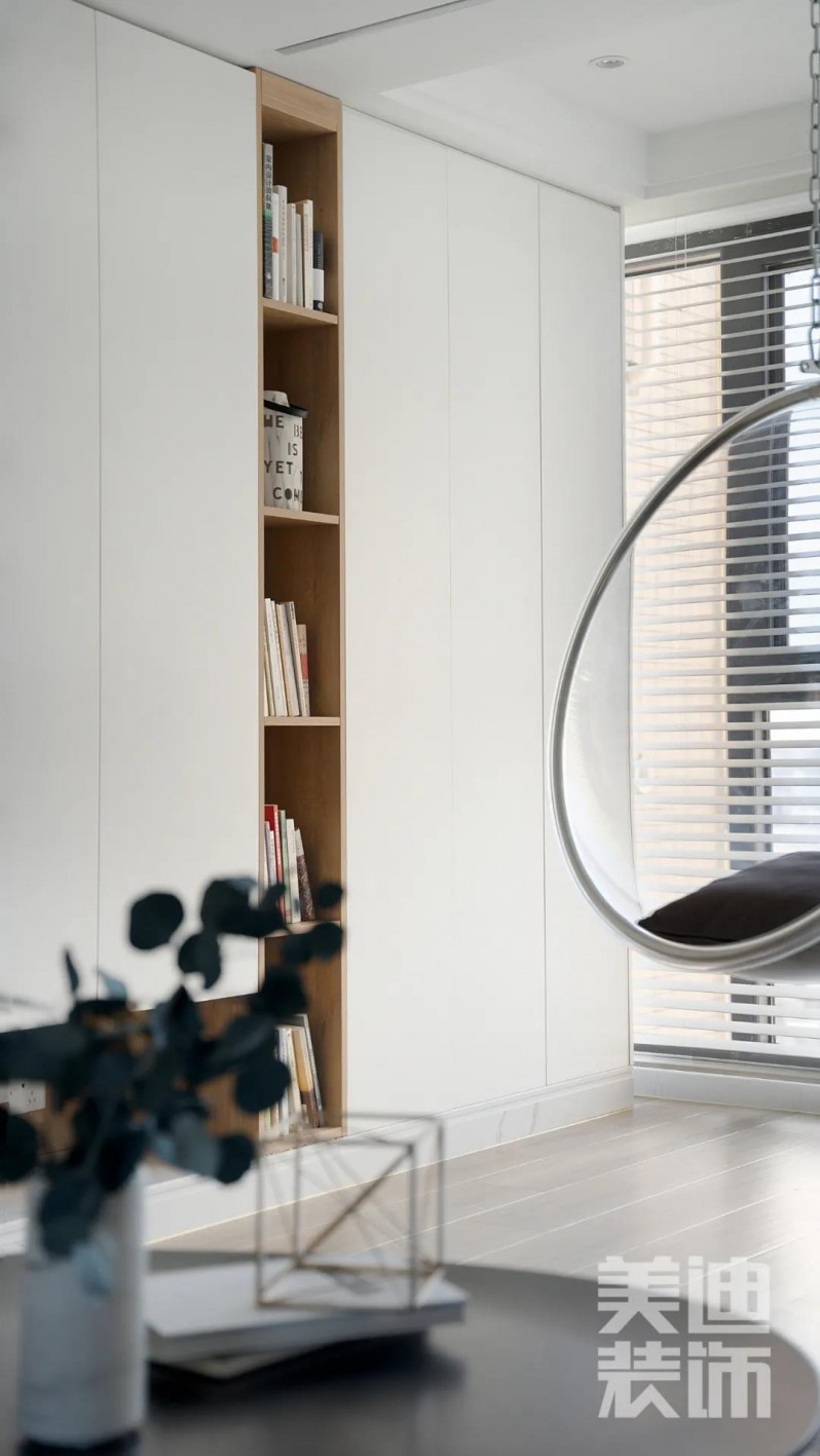 全屋采用管道新風系統,幾乎沒有灰塵。所以采用百頁窗的設計,通過不同時間段的光線折射,在視覺上為空間營造出特殊的裝飾美感。