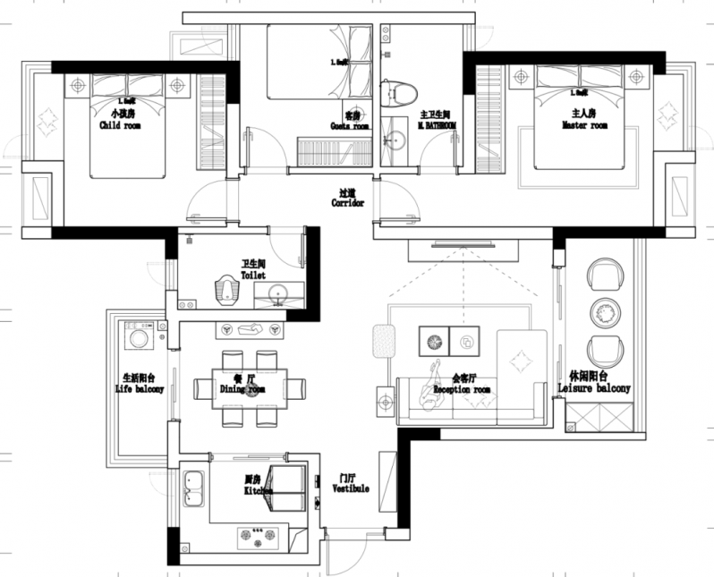 電視柜轉角采用透明90°玻璃柜門組合,增加視野的深度,擴大空間的感受。