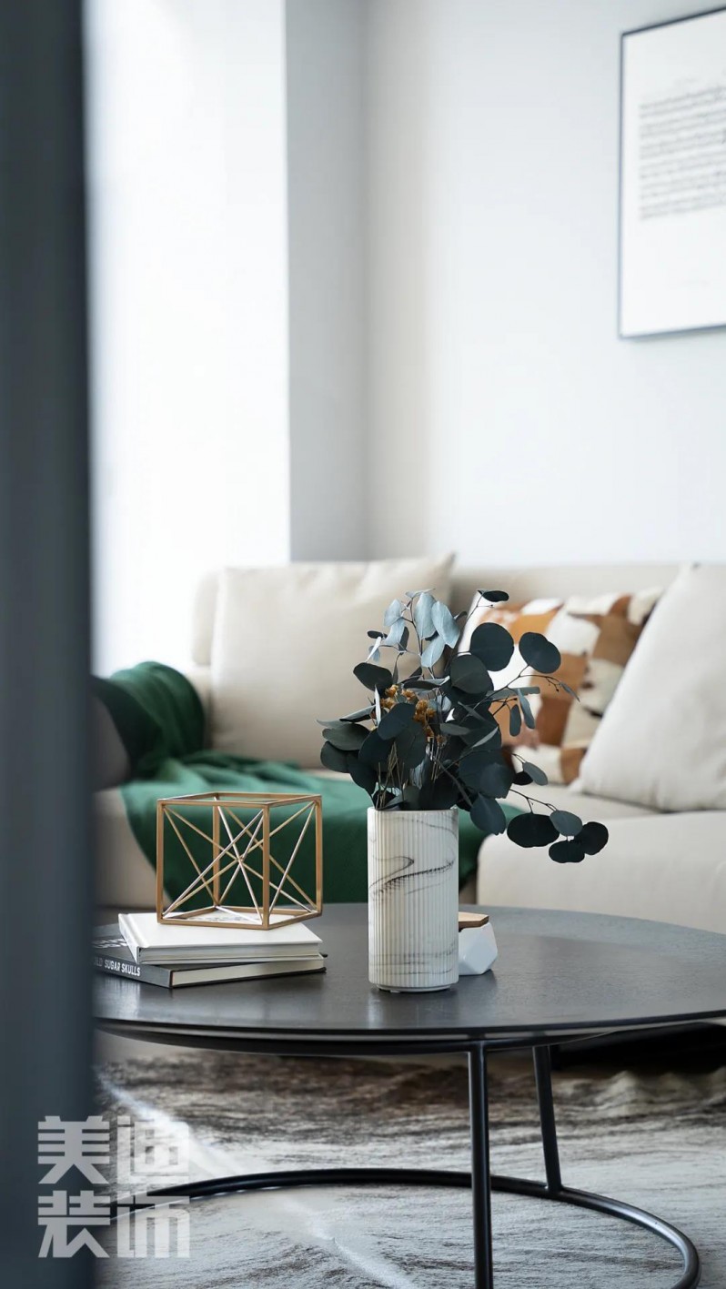 采用高低組合式的茶幾,靈活調整位置,異形加圓弧過渡的設計,更加安全,同時與沙發形體相呼應,中和了硬裝結構上的直線僵硬感。