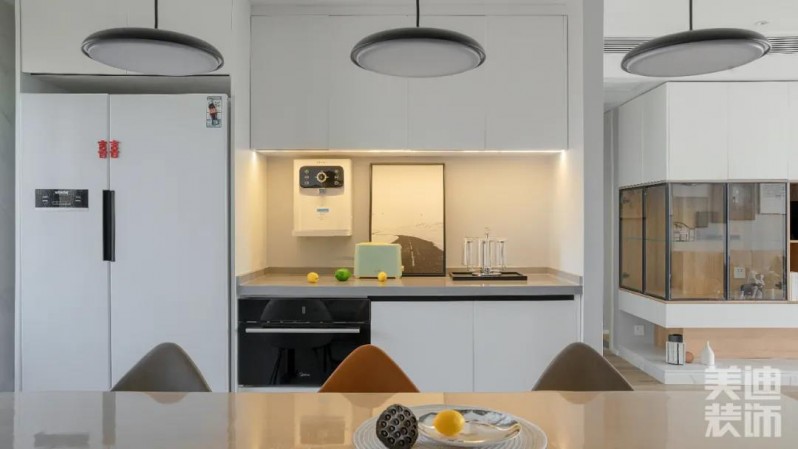在這個餐廚一體的空間里,格局非常的寬敞通透,極簡的設計,純白色的運用,干凈又清爽。空間重構后,電器的合理規劃排列,整整齊齊,沒有一絲的雜亂,讓做飯都變成了一種生活的美好享受。