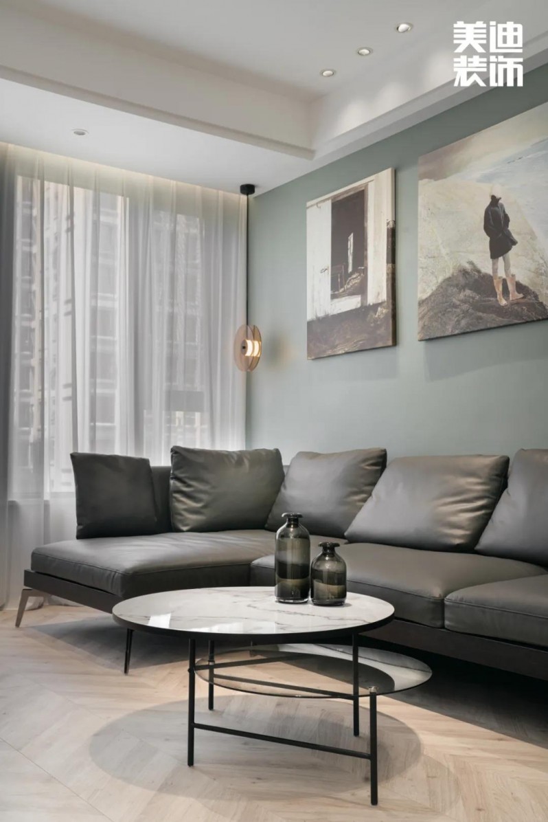 大理石茶幾簡單時尚,灰綠色墻面色彩飽和度低,舒適居家。藝術(shù)感十足的裝飾畫給家里增添幾分文藝氣息,使得居家生活更有品位。