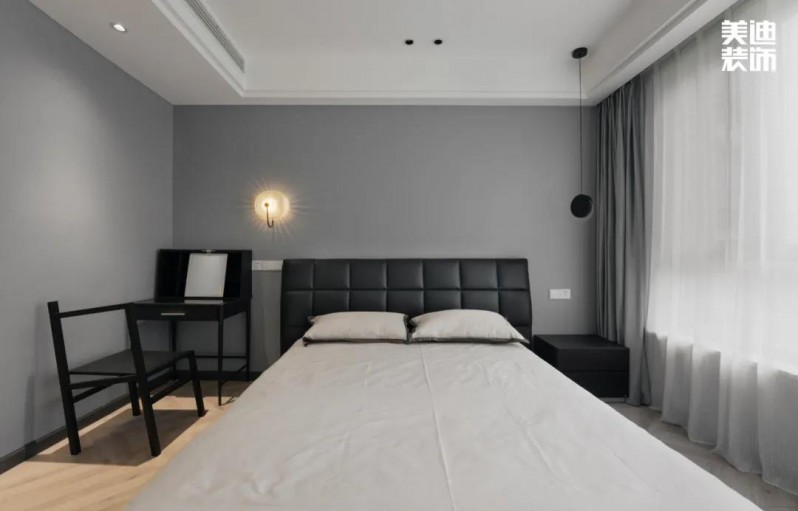 根據(jù)建筑形體設(shè)計黃色跟灰色的撞色對比,干凈整潔不失雅趣。滿頂設(shè)計,見光不見燈,床頭藝術(shù)壁燈點點光源,黑色騎士床品和梳妝臺相互依偎色調(diào)和諧。雙層絨布面料搭配魚骨紗窗簾,遮光又不失通透感的白紗,硬朗中帶有溫柔感。