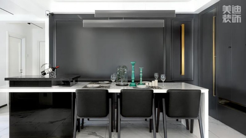 熱情好客的業(yè)主打造了一個(gè)近10平米的超大半開放U型廚房,開闊又通透,客餐廳一體化,延伸視覺形成了一個(gè)長且敞亮的空間,簡單又不乏設(shè)計(jì)感,定制4mX2m大理石餐桌,可同時(shí)容納15人就餐,純白色桌面搭配黑色餐椅,大氣又高級。