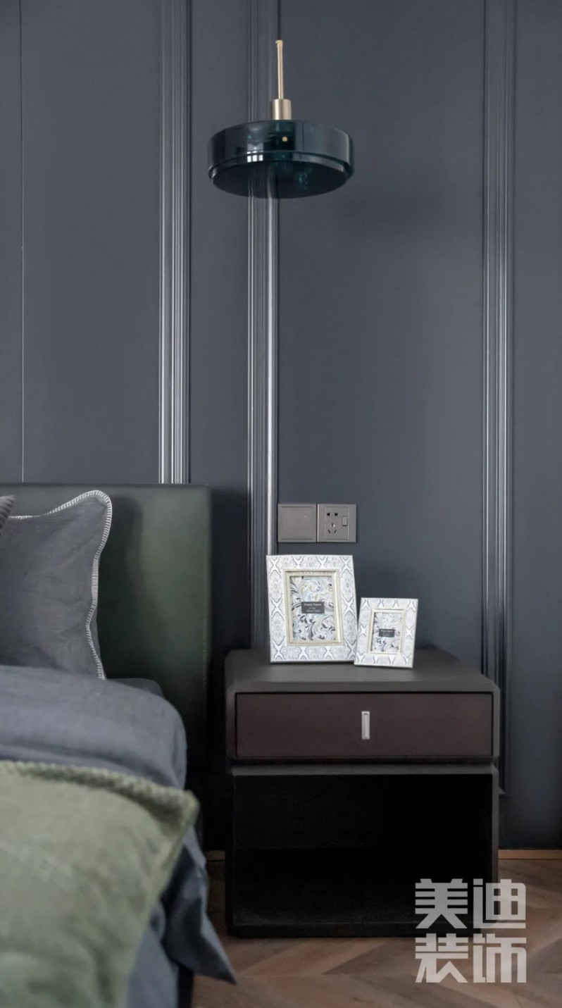 臥室黑白搭配的顏色,現(xiàn)代設(shè)計(jì)感十足的全銅吊燈垂于床頭兩側(cè),精致奢華,莫蘭迪色床品清新舒適感滿滿,白色背景墻上的晶瓷裝飾畫,整個(gè)空間被藝術(shù)感包圍。