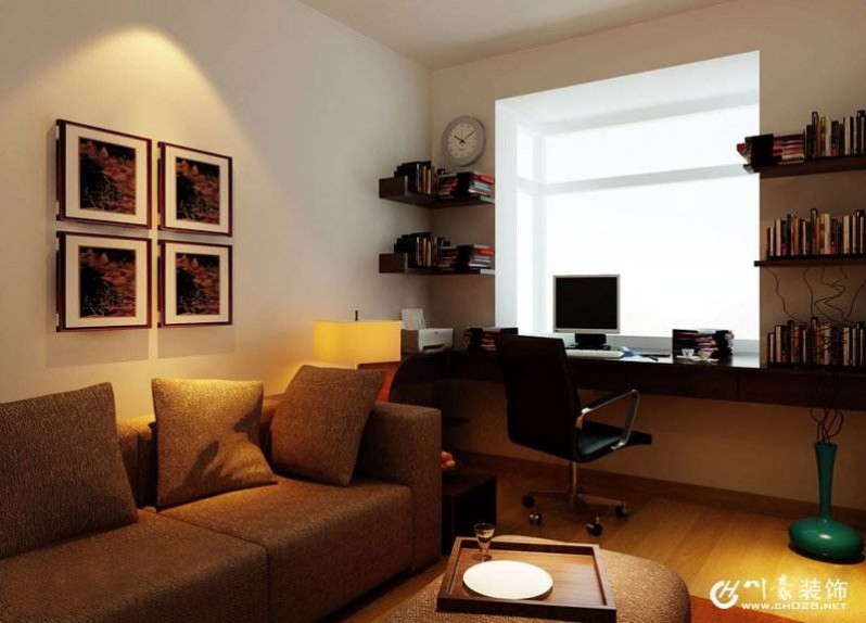 七、在色彩方面,書房環(huán)境的顏色和家具顏色,使用冷色調(diào)者居多,這有助于人的心境平穩(wěn)、氣血通暢。由于書房是長時間使用的場所,應(yīng)避免強烈刺激,宜多用明亮的無彩色或灰棕色等中性顏色。為了得到一個統(tǒng)一的情調(diào)。家具和擺設(shè)的本色,可以與四壁的顏色使用同一個調(diào)子,在其中點綴一些和諧的色彩。如書柜里的小工藝品,墻上的裝飾畫(在購買裝飾畫時,要注意其在色彩上是為點綴用,在形式上要與整體布局協(xié)調(diào))。這樣,可打破略顯單調(diào)的環(huán)境。