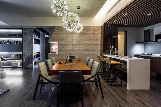 家居餐廳燈光裝飾的焦點當然是餐桌。燈飾一般可用垂懸的吊燈,為了達到效果,吊燈不能安裝太高,在用膳者的視平線上即可。