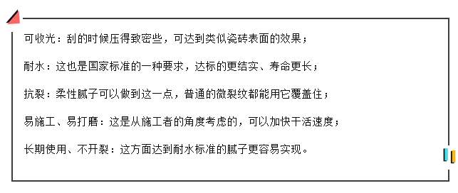 膩子最基本的功能就是找平和涂白,但除此之外,在勞動人民的偉大創造力與先進的科學研究結合之下,膩子的發展演變也是十分迅速的,現在市場上能找到的膩子已經具備了很多其他的功能,比如: