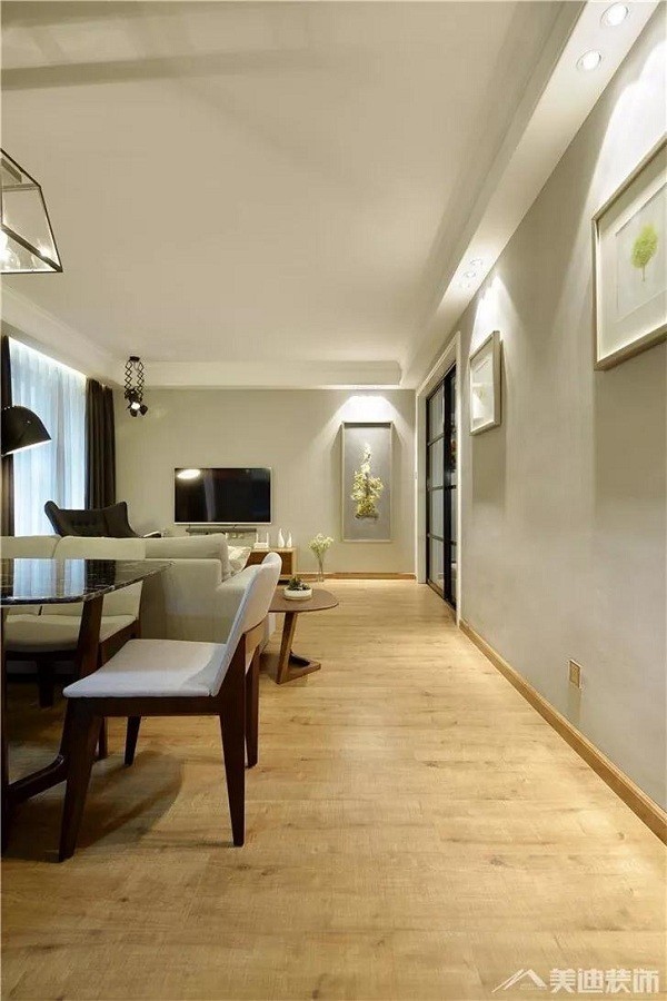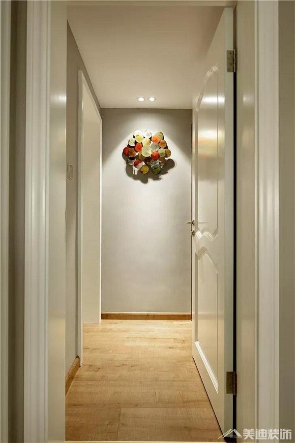 走廊通道的設(shè)計(jì),木質(zhì)地板與白色門框以及墻壁相輔相成,墻壁上的藝術(shù)設(shè)計(jì)作品,配上頂光照射下的陰影,顯得更加柔和溫馨。