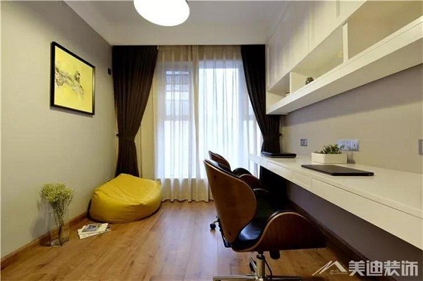 靠墻做了一排書柜和書桌是考慮男女主人可以同時(shí)在此工作、娛樂,原來的墻壁也敲去與客廳打通利用隔斷門來分割。