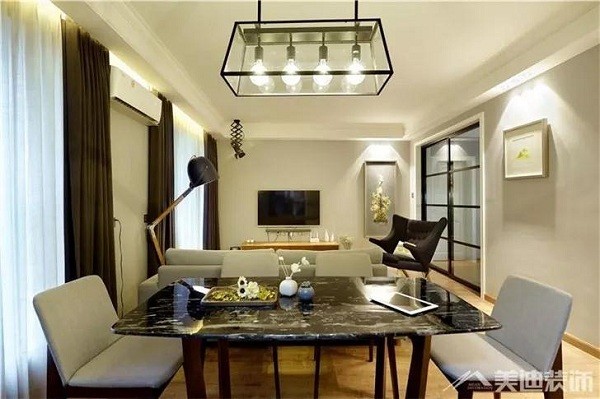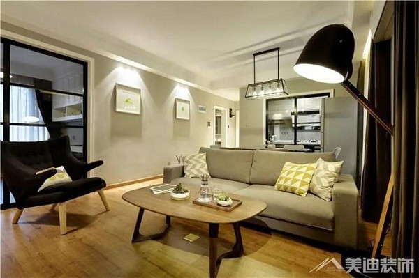 客廳沒有使用使用主燈,而是在客廳的左上方向安裝了一盞投射燈,燈光打在茶幾上,營造一種溫暖的氛圍。