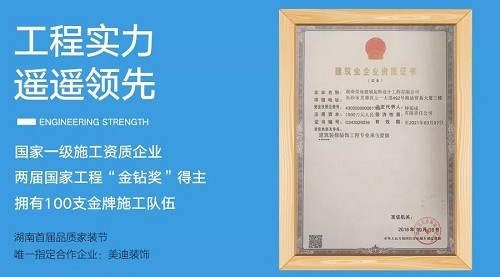 美迪裝飾工程品質得到了國家住建部的認可,2016年被國家住建部授予國家一級施工資質,它是家裝工程的最高榮譽,擁有該資質的家裝企業僅為千分之一。每一道工藝都將經過嚴格管控,層層把關,才會交付到業主手中,確保工程的高品質和高水準。