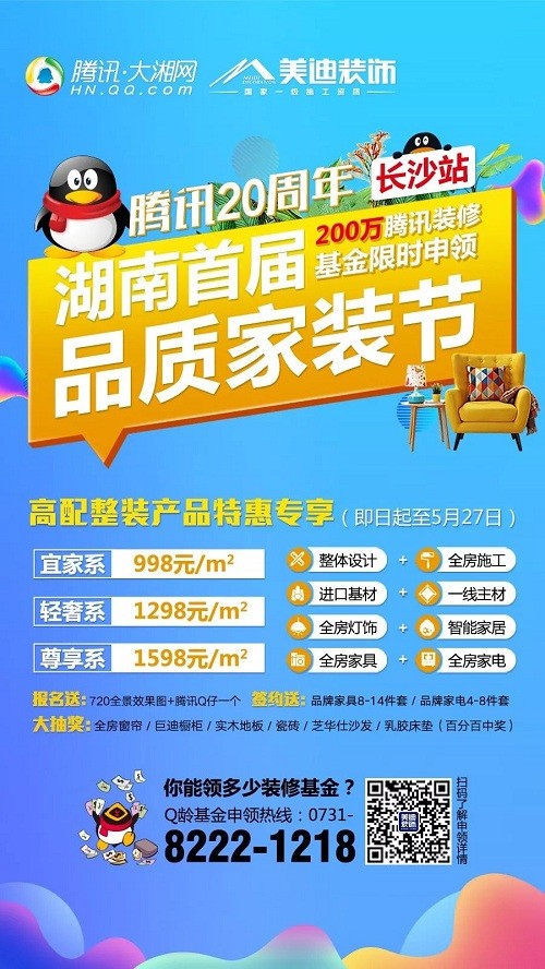 今年,陪伴一代人青春的騰訊QQ迎來了自己的20周年,20歲的騰訊,在互聯網的全面布局和發展中,也將曾經虛擬世界的陪伴深入到社會責任中。為感謝廣大網友對騰訊湖南的支持與厚愛,解決湖南人裝修中遭遇的實際痛點難點,特舉辦湖南首屆品質家裝節,為騰訊網友提供裝修基金及高品質裝修服務。