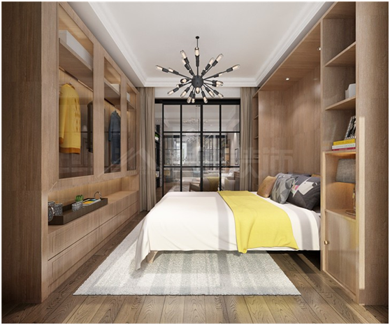 主臥不同于次臥,主要以木色調(diào)為主,透明的落地窗設(shè)計(jì),擴(kuò)大了視覺上的空間感。內(nèi)嵌的衣柜設(shè)計(jì)不僅節(jié)省了空間,收納性也很好。