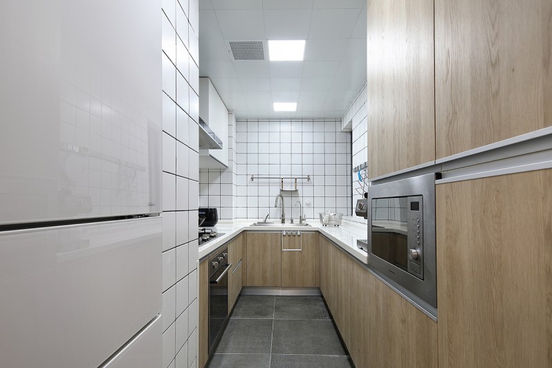 狹長的廚房空間,完美的突出了日式風格的主題,不浪費每一寸地方。廚房的設計,讓整個空間都變的通透又寬敞起來。