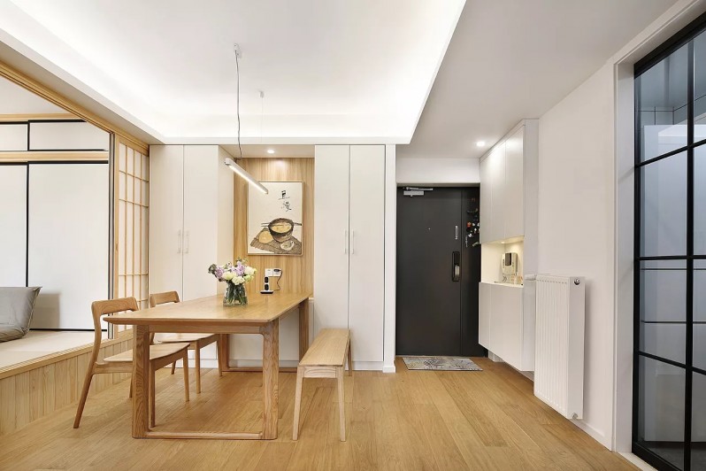 溫潤的木色與簡單的白色相搭配,營造出舒適的居家環境。玄關處裝修非常簡潔,沒有做任何設計,空間上一覽無余。
