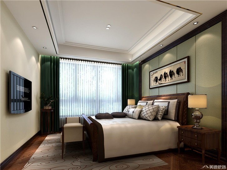 富有光澤的床具十分有質感,加上暖黃色的燈光,臥室整體顯得高貴祥和;床頭兩側的金屬感臺燈帶有幾分現代感;床尾凳裝飾性與實用性兼具,角落的擺設帶有古意,從細節上提升了臥房品質。