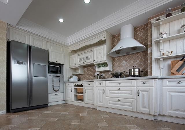 廚房風水學上說,廚房是煙熏火燎的地方,溫度比較高,如果用冷色調的話就不會感覺那么熱。因此吊頂用最簡單的白色就可以了。白色可以讓人忽略吊頂的存在,不會覺得天花板低。