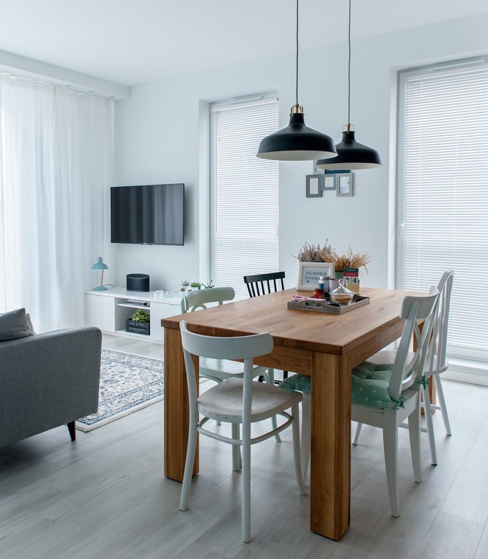 白色的百葉窗擠壓了電視背景墻的空間,但是兩扇純白的百葉窗更具強調感,也增加了空間的通透感。