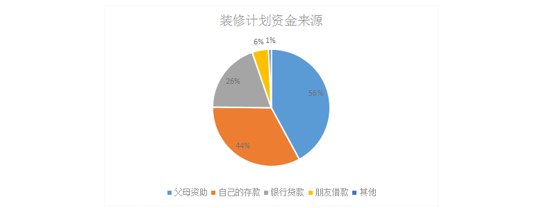 根據調查結果顯示,56%的長沙人在面臨裝修的時候需要靠父母資助,44%的長沙人可以靠自己的存款完成裝修,26%的長沙人愿意選擇銀行貸款來緩解裝修帶來的資金壓力。